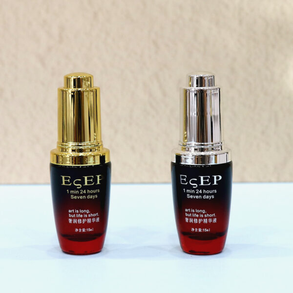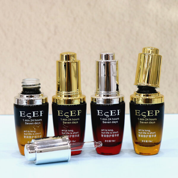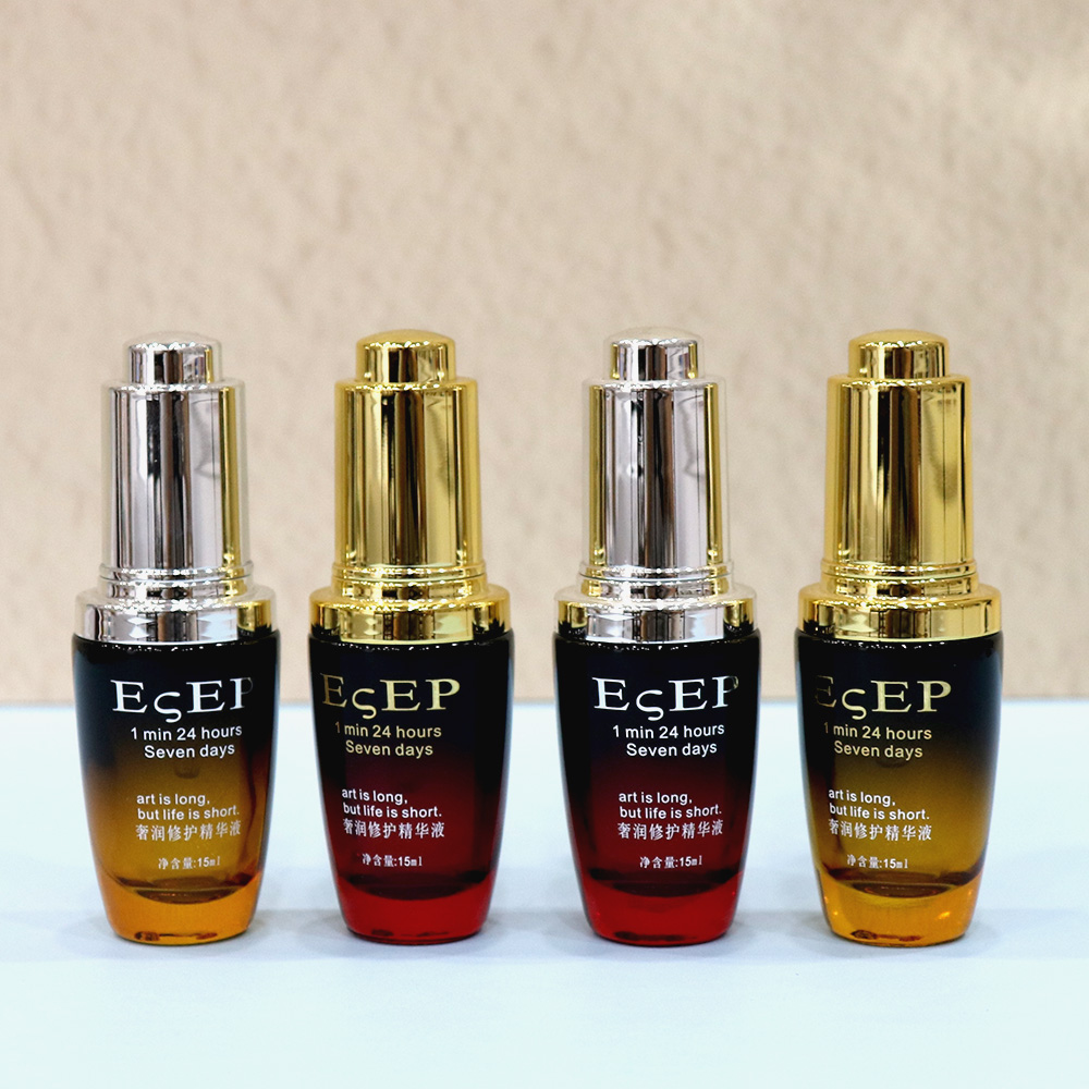 Cone shaped small capacity glass bottle,Gold plated press drip pump glass bottle