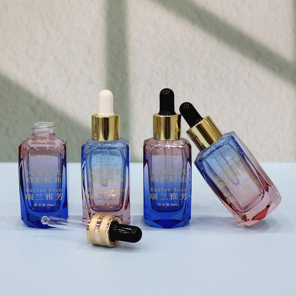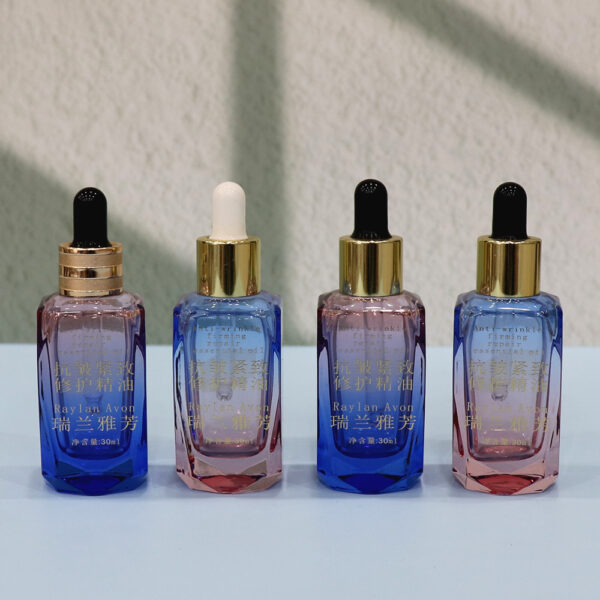 Spray painted frosted semi transparent gray glass bottle,Half transparent blue dropper bottle