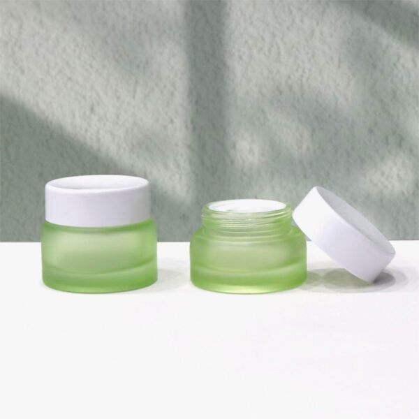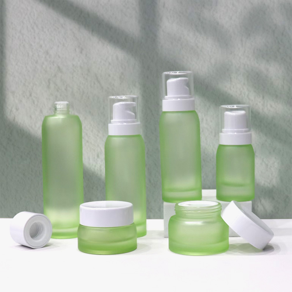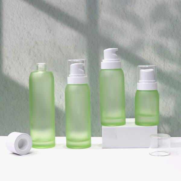 Glass bottle with white pump head and transparent lid,Half transparent frosted green skincare product set bottle
