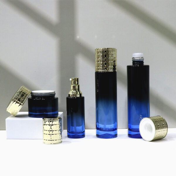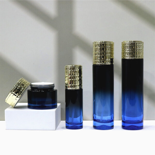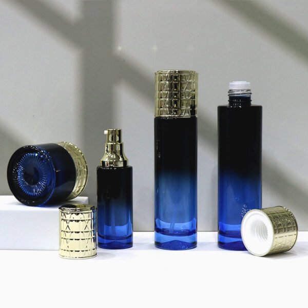 High end cosmetics set glass bottle,Black blue gradient straight circular glass bottle